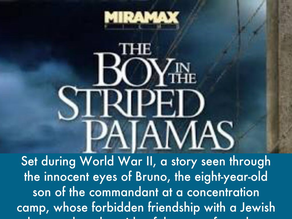 Set during World War II, a story seen through the innocent eyes of Bruno, the eight-year-old son of the commandant at a concentration camp, whose forbidden friendship with a Jewish boy on the other side of the camp fence has startling and unexpected consequences.