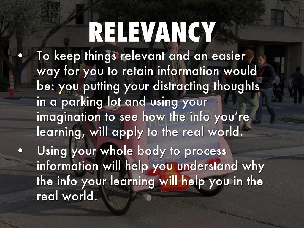 To keep things relevant and an easier way for you to retain information would be: you putting your distracting thoughts in a parking lot and using your imagination to see how the info you’re learning, will apply to the real world.