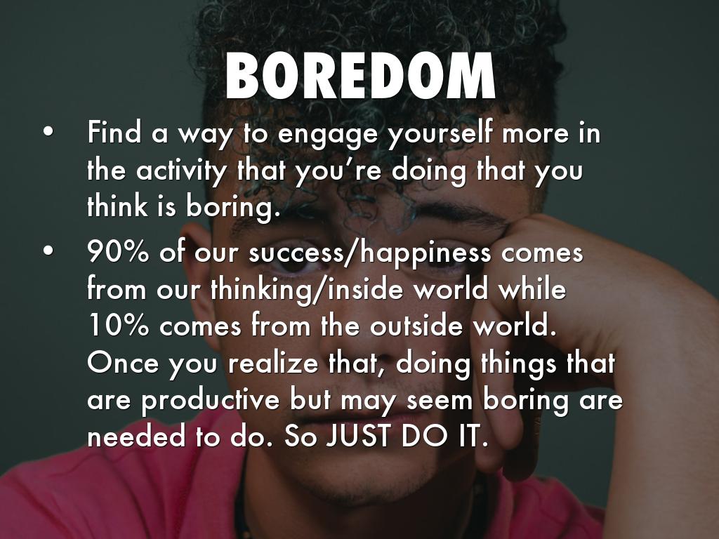90% of our success/happiness comes from our thinking/inside world while 10% comes from the outside world. Once you realize that, doing things that are productive but may seem boring are needed to do. So JUST DO IT.