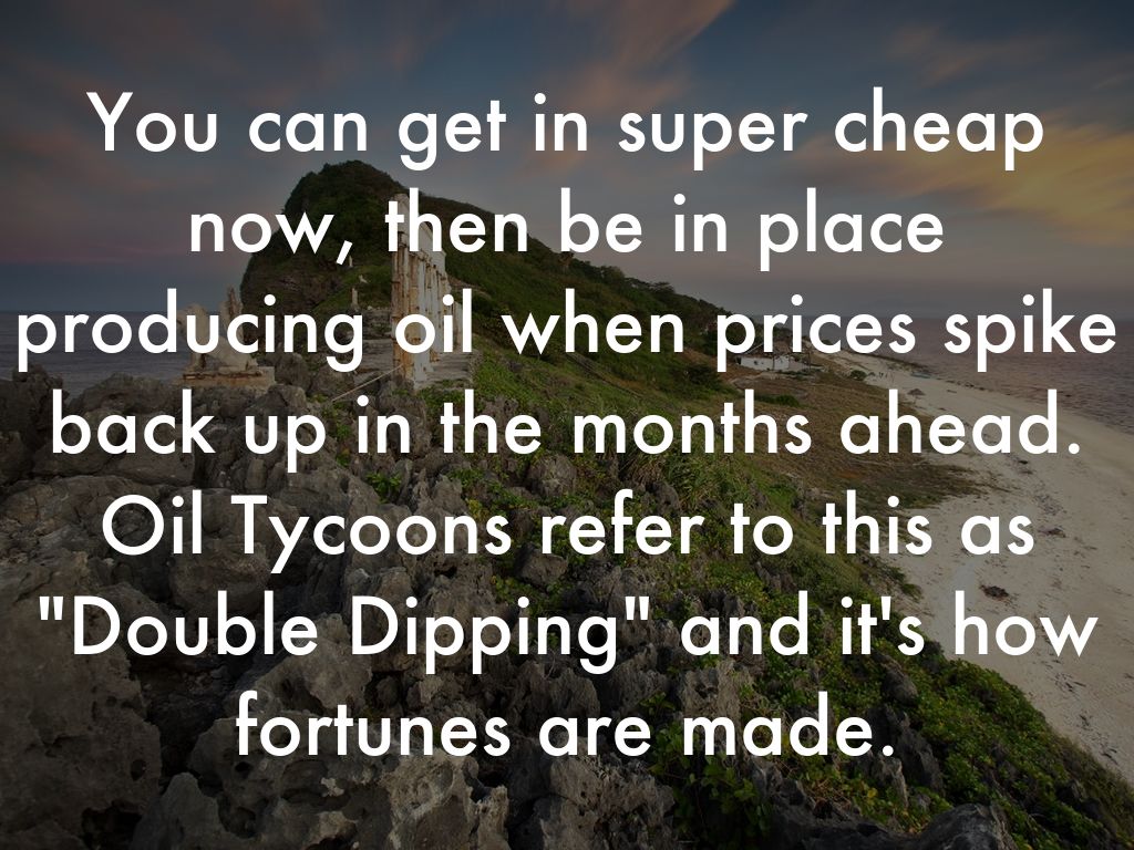 You can get in super cheap now, then be in place producing oil when prices spike back up in the months ahead. Oil Tycoons refer to this as "Double Dipping" and it's how fortunes are made.