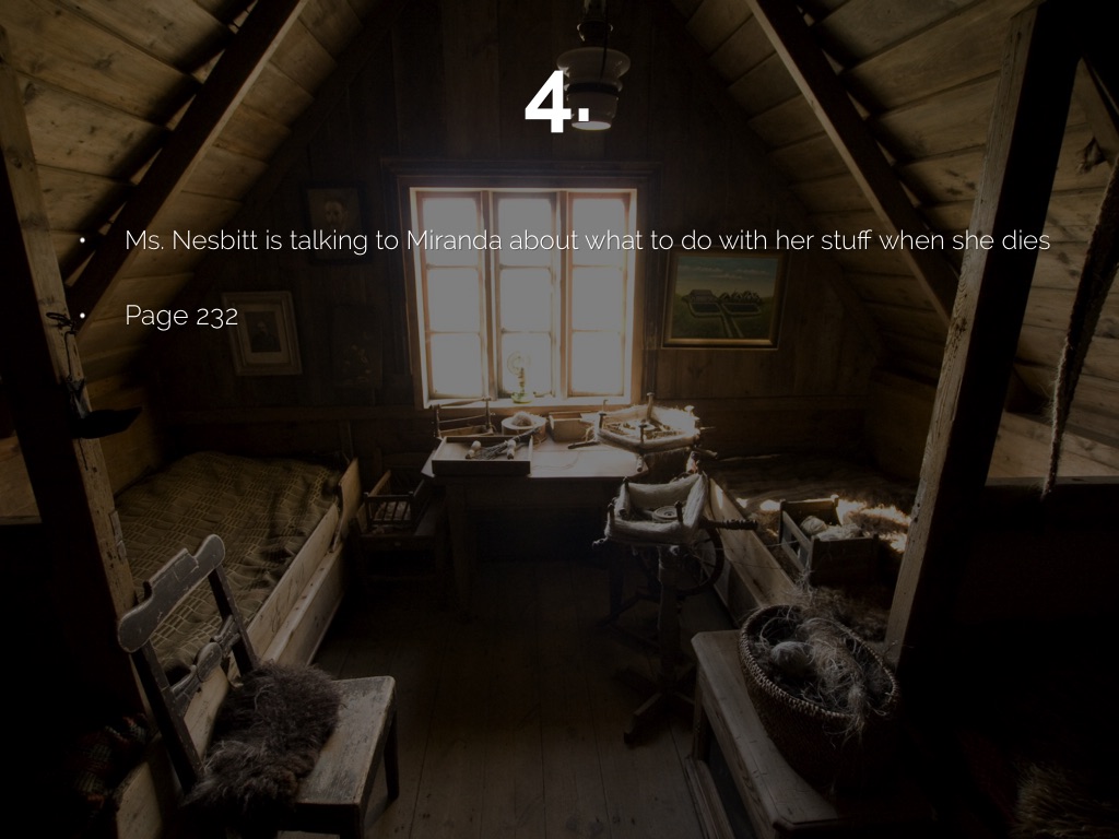 • Ms. Nesbitt is talking to Miranda about what to do with her stuff when she dies
