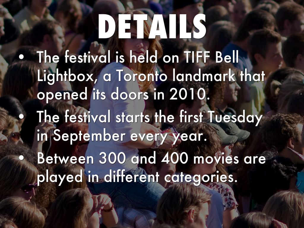 The festival is held on TIFF Bell Lightbox, a Toronto landmark that opened its doors in 2010.