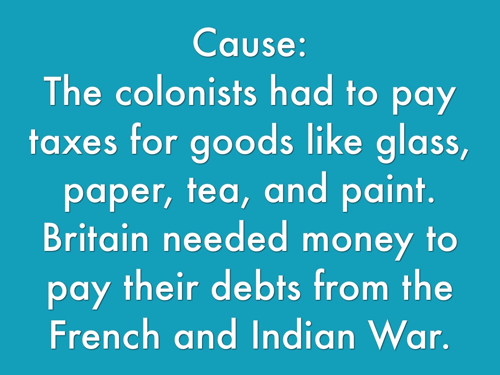 The colonists had to pay taxes for goods like glass, paper, tea, and paint. Britain needed money to pay their debts from the French and Indian War.