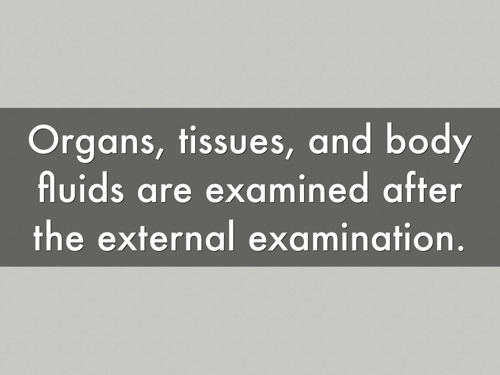 Organs, tissues, and body fluids are examined after the external examination.