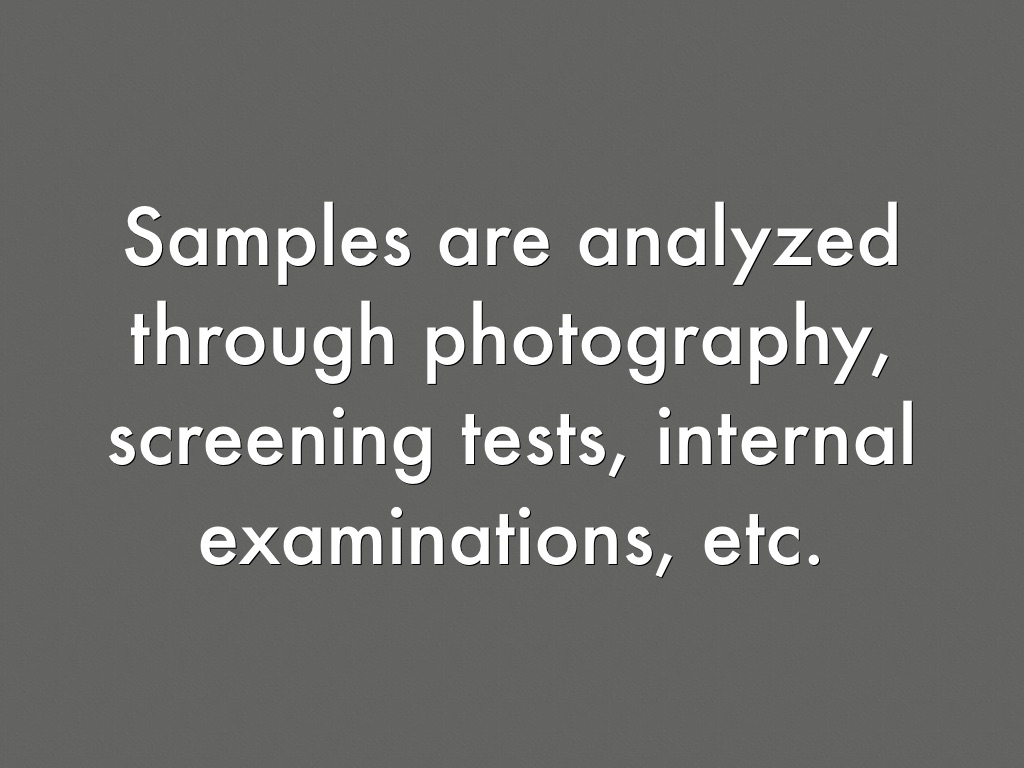 Samples are analyzed through photography, screening tests, internal examinations, etc.
