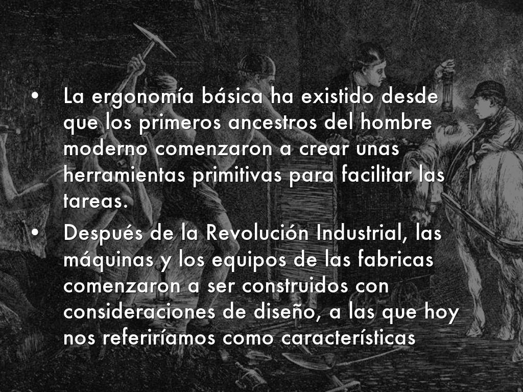 Después de la Revolución Industrial, las máquinas y los equipos de las fabricas comenzaron a ser construidos con consideraciones de diseño, a las que hoy nos referiríamos como características ergonómicas.