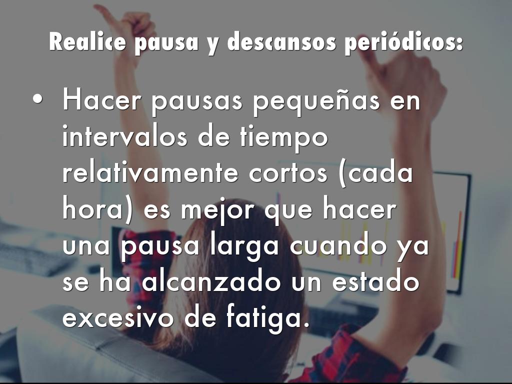 Hacer pausas pequeñas en intervalos de tiempo relativamente cortos (cada hora) es mejor que hacer una pausa larga cuando ya se ha alcanzado un estado excesivo de fatiga.
