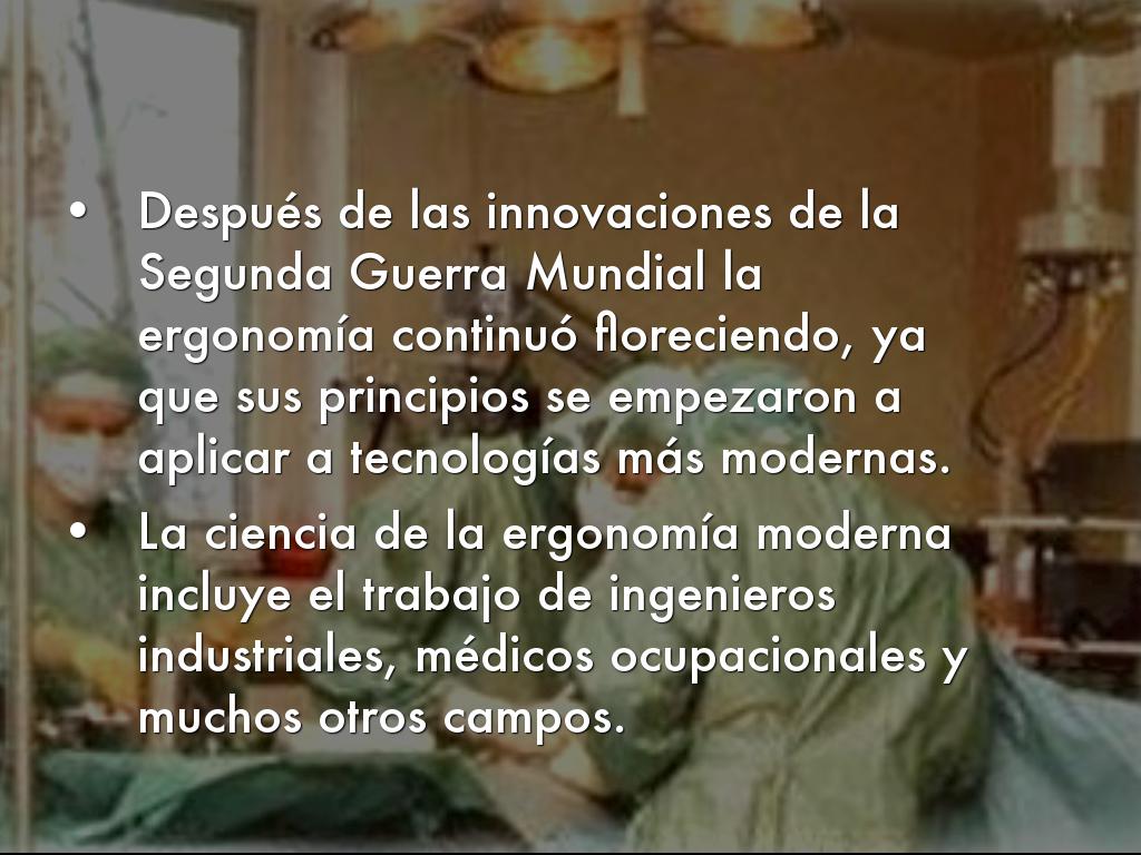 Después de las innovaciones de la Segunda Guerra Mundial la ergonomía continuó floreciendo, ya que sus principios se empezaron a aplicar a tecnologías más modernas.