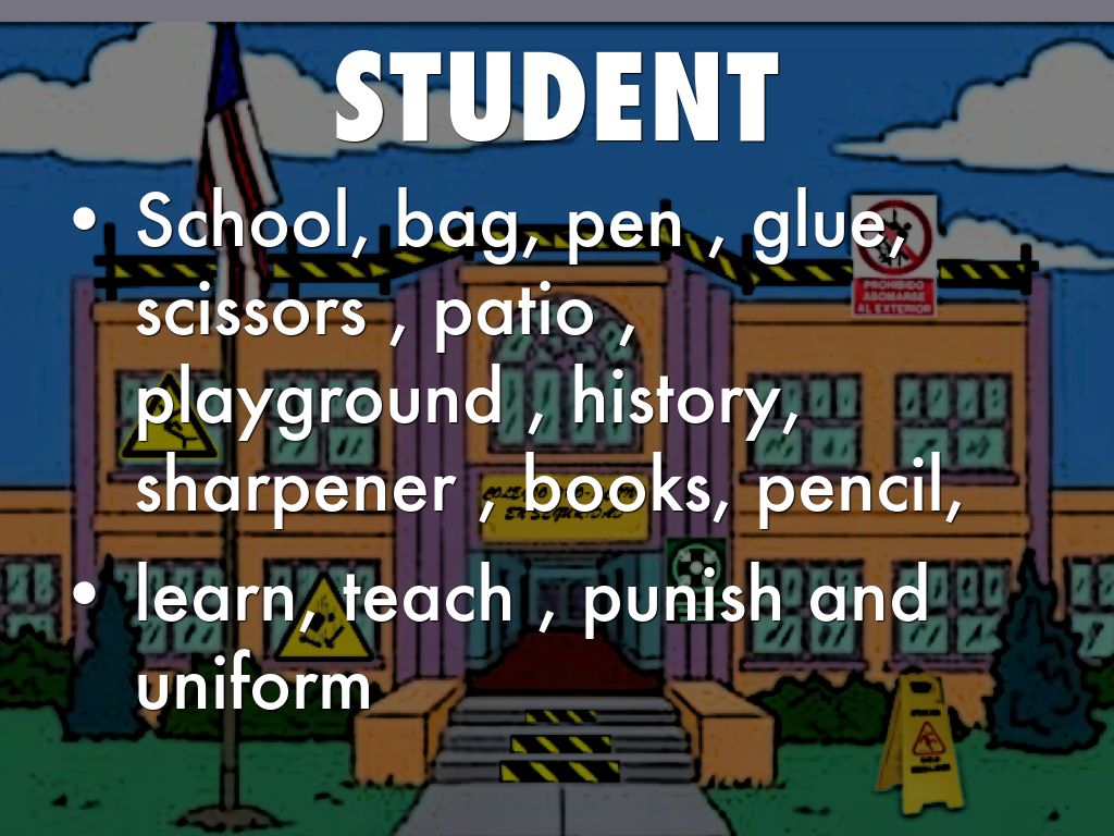 School, bag, pen , glue, scissors , patio , playground , history, sharpener , books, pencil,