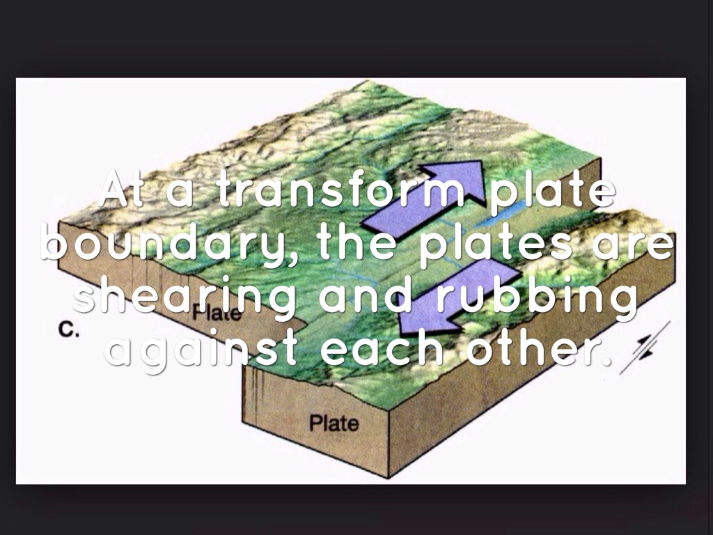 At a transform plate boundary, the plates are shearing and rubbing against each other.
