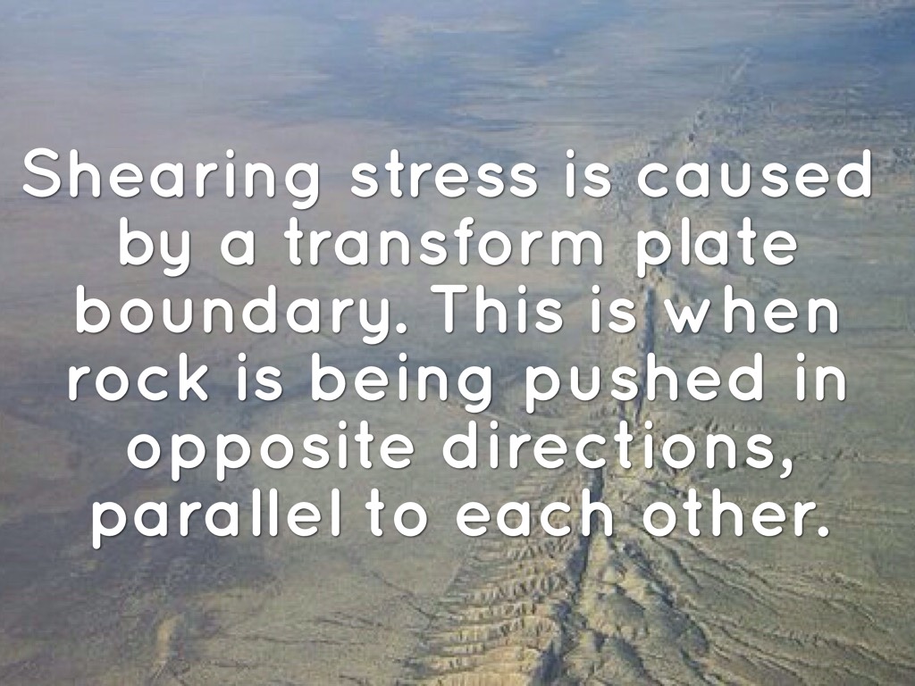 Shearing stress is caused by a transform plate boundary. This is when rock is being pushed in opposite directions, parallel to each other.