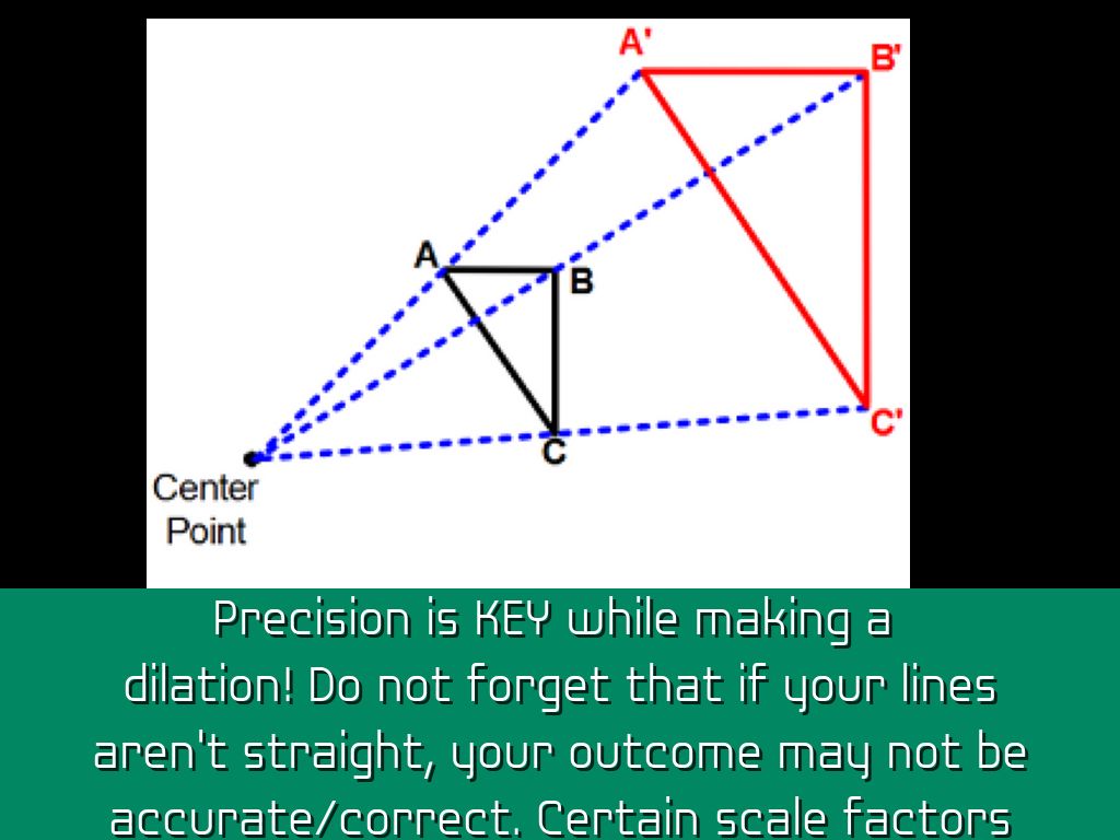 dilation! Do not forget that if your lines aren't straight, your outcome may not be accurate/correct. Certain scale factors shrink and dilate figures. If the scale factor is negative it flips over the original figure. If it's less than 1 it shrinks, and if it's greater than one it enlarges. Finally, if the scalw factor is 1, the figure stays the same.