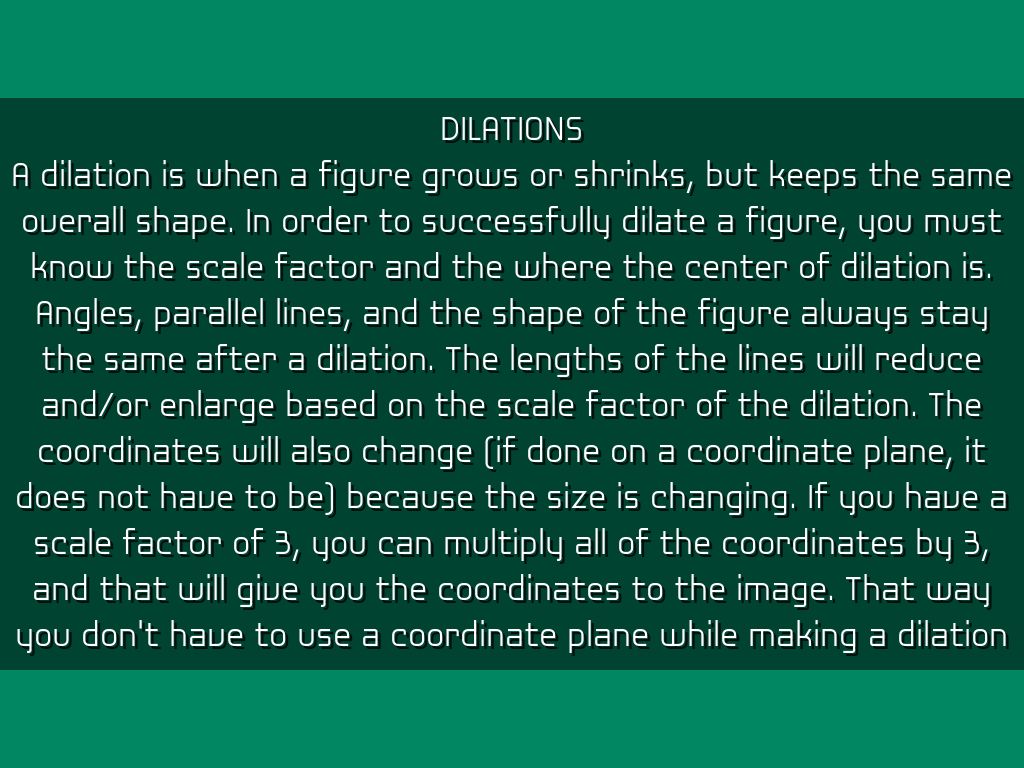 A dilation is when a figure grows or shrinks, but keeps the same overall shape. In order to successfully dilate a figure, you must know the scale factor and the where the center of dilation is. Angles, parallel lines, and the shape of the figure always stay the same after a dilation. The lengths of the lines will reduce and/or enlarge based on the scale factor of the dilation. The coordinates will also change (if done on a coordinate plane, it does not have to be) because the size is changing. If you have a scale factor of 3, you can multiply all of the coordinates by 3, and that will give you the coordinates to the image. That way you don't have to use a coordinate plane while making a dilation