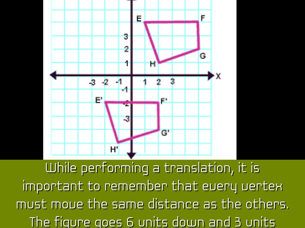 While performing a translation, it is important to remember that every vertex must move the same distance as the others. The figure goes 6 units down and 3 units right.