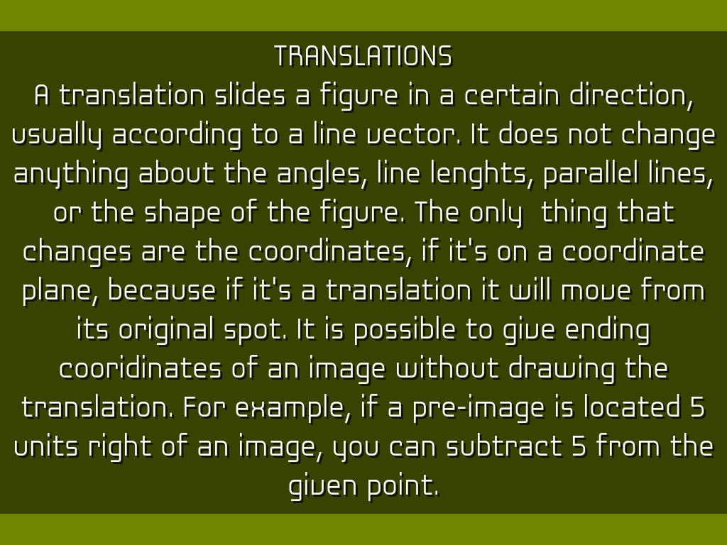 A translation slides a figure in a certain direction, usually according to a line vector. It does not change anything about the angles, line lenghts, parallel lines, or the shape of the figure. The only thing that changes are the coordinates, if it's on a coordinate plane, because if it's a translation it will move from its original spot. It is possible to give ending cooridinates of an image without drawing the translation. For example, if a pre-image is located 5 units right of an image, you can subtract 5 from the given point.