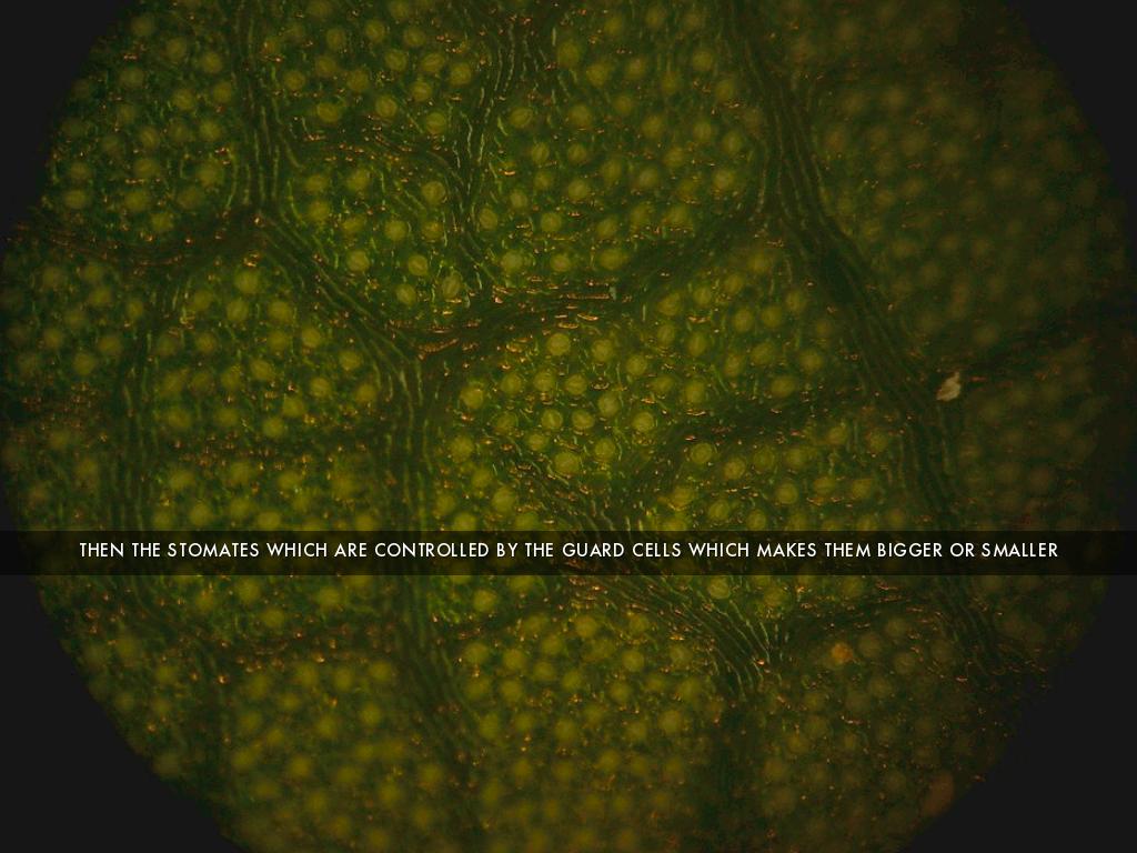 THEN THE STOMATES WHICH ARE CONTROLLED BY THE GUARD CELLS WHICH MAKES THEM BIGGER OR SMALLER