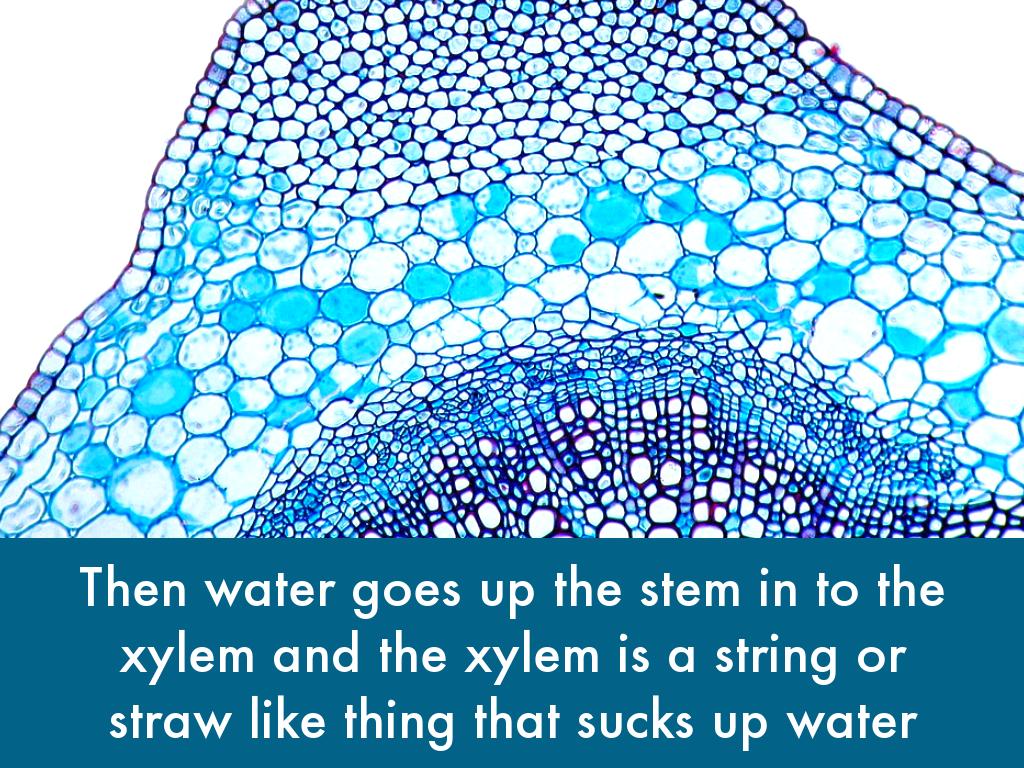 Then water goes up the stem in to the xylem and the xylem is a string or straw like thing that sucks up water