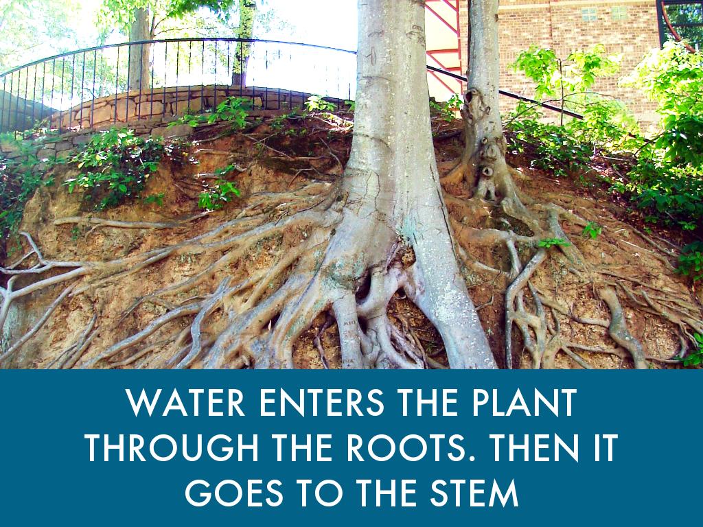 WATER ENTERS THE PLANT THROUGH THE ROOTS. THEN IT GOES TO THE STEM