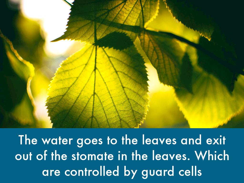 The water goes to the leaves and exit out of the stomate in the leaves. Which are controlled by guard cells