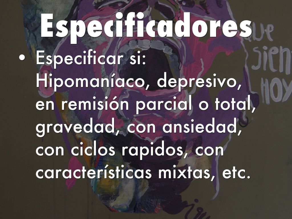 Especificar si: Hipomaníaco, depresivo, en remisión parcial o total, gravedad, con ansiedad, con ciclos rapidos, con características mixtas, etc.