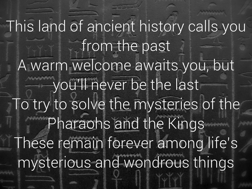 This land of ancient history calls you from the past A warm welcome awaits you, but you’ll never be the last To try to solve the mysteries of the Pharaohs and the Kings These remain forever among life’s mysterious and wondrous things