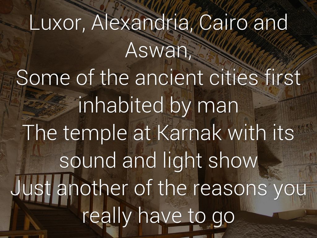 Luxor, Alexandria, Cairo and Aswan, Some of the ancient cities first inhabited by man The temple at Karnak with its sound and light show Just another of the reasons you really have to go