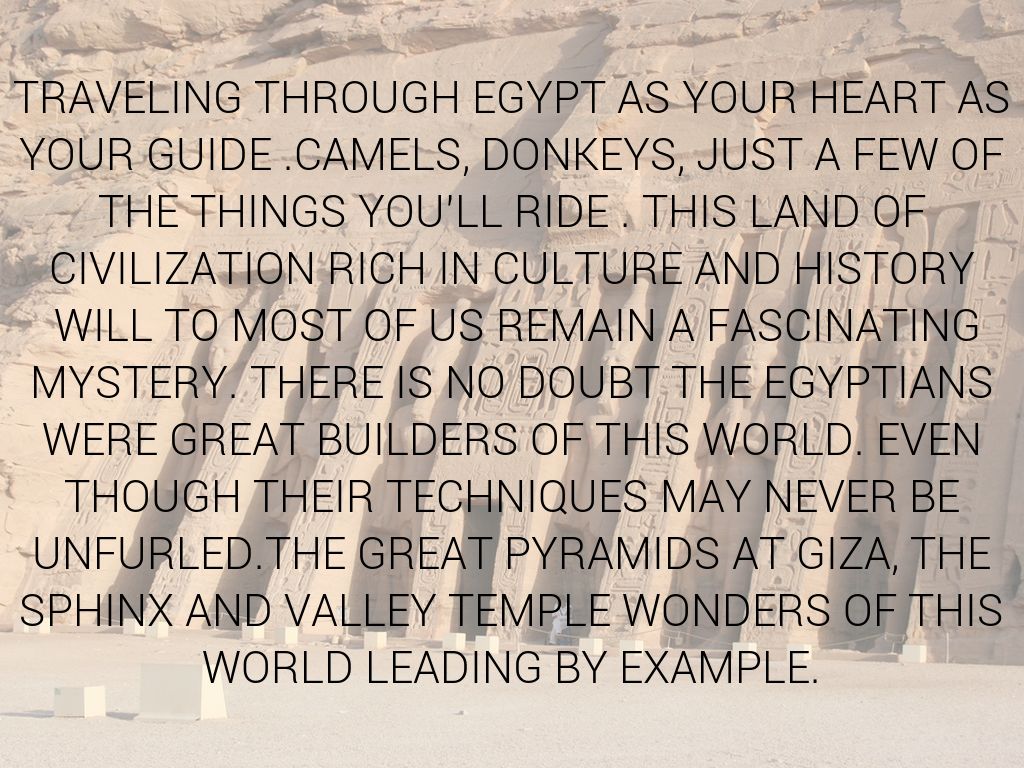 TRAVELING THROUGH EGYPT AS YOUR HEART AS YOUR GUIDE .CAMELS, DONKEYS, JUST A FEW OF THE THINGS YOU’LL RIDE . THIS LAND OF CIVILIZATION RICH IN CULTURE AND HISTORY WILL TO MOST OF US REMAIN A FASCINATING MYSTERY. THERE IS NO DOUBT THE EGYPTIANS WERE GREAT BUILDERS OF THIS WORLD. EVEN THOUGH THEIR TECHNIQUES MAY NEVER BE UNFURLED.THE GREAT PYRAMIDS AT GIZA, THE SPHINX AND VALLEY TEMPLE WONDERS OF THIS WORLD LEADING BY EXAMPLE.