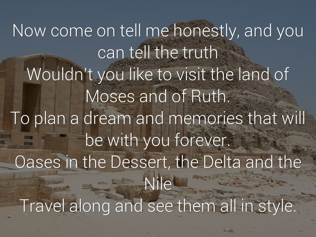 Now come on tell me honestly, and you can tell the truth Wouldn’t you like to visit the land of Moses and of Ruth. To plan a dream and memories that will be with you forever. Oases in the Dessert, the Delta and the Nile Travel along and see them all in style.