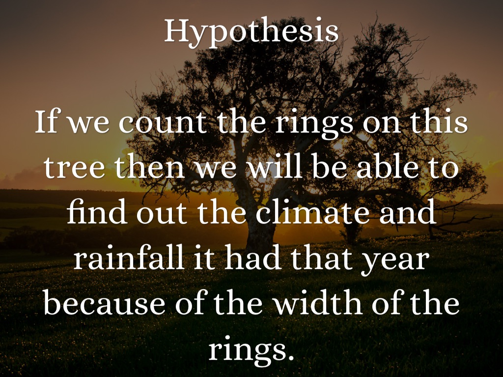 During the experiment we found that image 1 was the youngest at 12 yrs old, the tree slab was the second youngest at 34 yrs old , and image 2 was the oldest at 50 yrs old