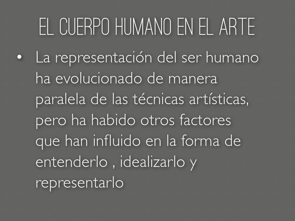 La representación del ser humano ha evolucionado de manera paralela de las técnicas artísticas, pero ha habido otros factores que han influido en la forma de entenderlo , idealizarlo y representarlo