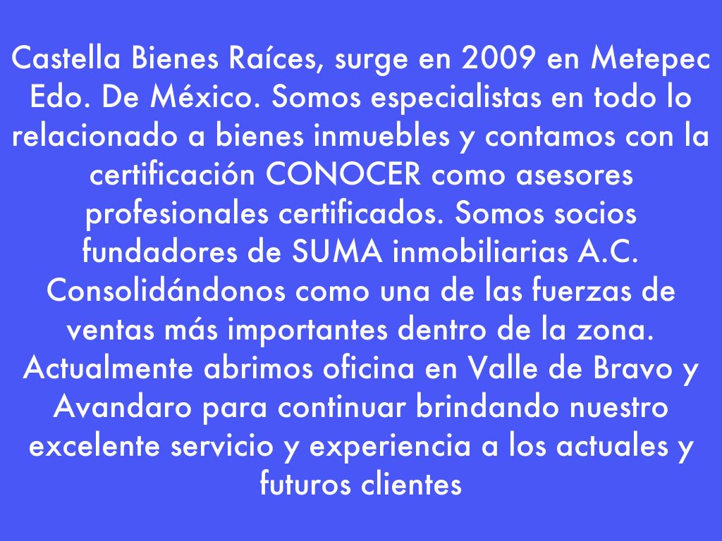 Castella Bienes Raíces, surge en 2009 en Metepec Edo. De México. Somos especialistas en todo lo relacionado a bienes inmuebles y contamos con la certificación CONOCER como asesores profesionales certificados. Somos socios fundadores de SUMA inmobiliarias A.C. Consolidándonos como una de las fuerzas de ventas más importantes dentro de la zona.