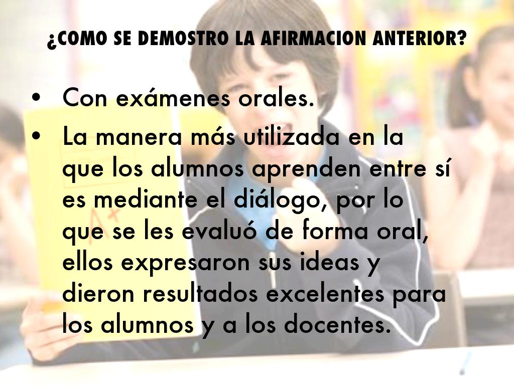- La manera más utilizada en la que los alumnos aprenden entre sí es mediante el diálogo, por lo que se les evaluó de forma oral, ellos expresaron sus ideas y dieron resultados excelentes para los alumnos y a los docentes.