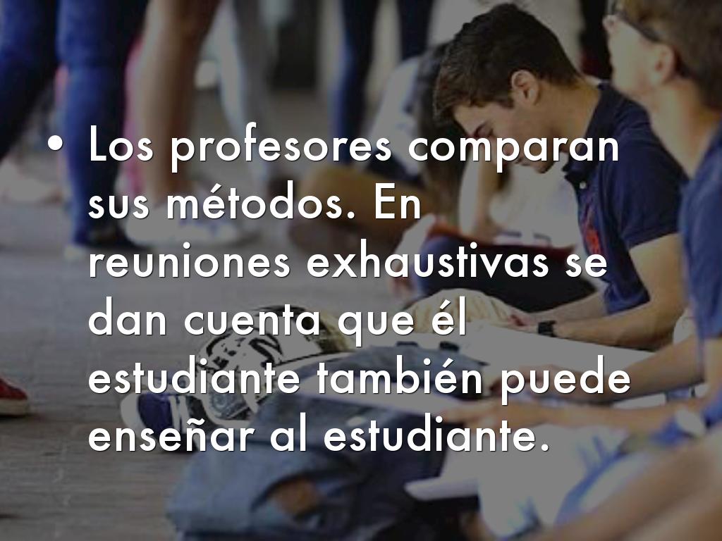- Los profesores comparan sus métodos. En reuniones exhaustivas se dan cuenta que él estudiante también puede enseñar al estudiante.