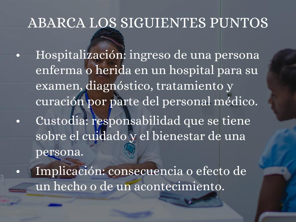 Hospitalización: ingreso de una persona enferma o herida en un hospital para su examen, diagnóstico, tratamiento y curación por parte del personal médico.