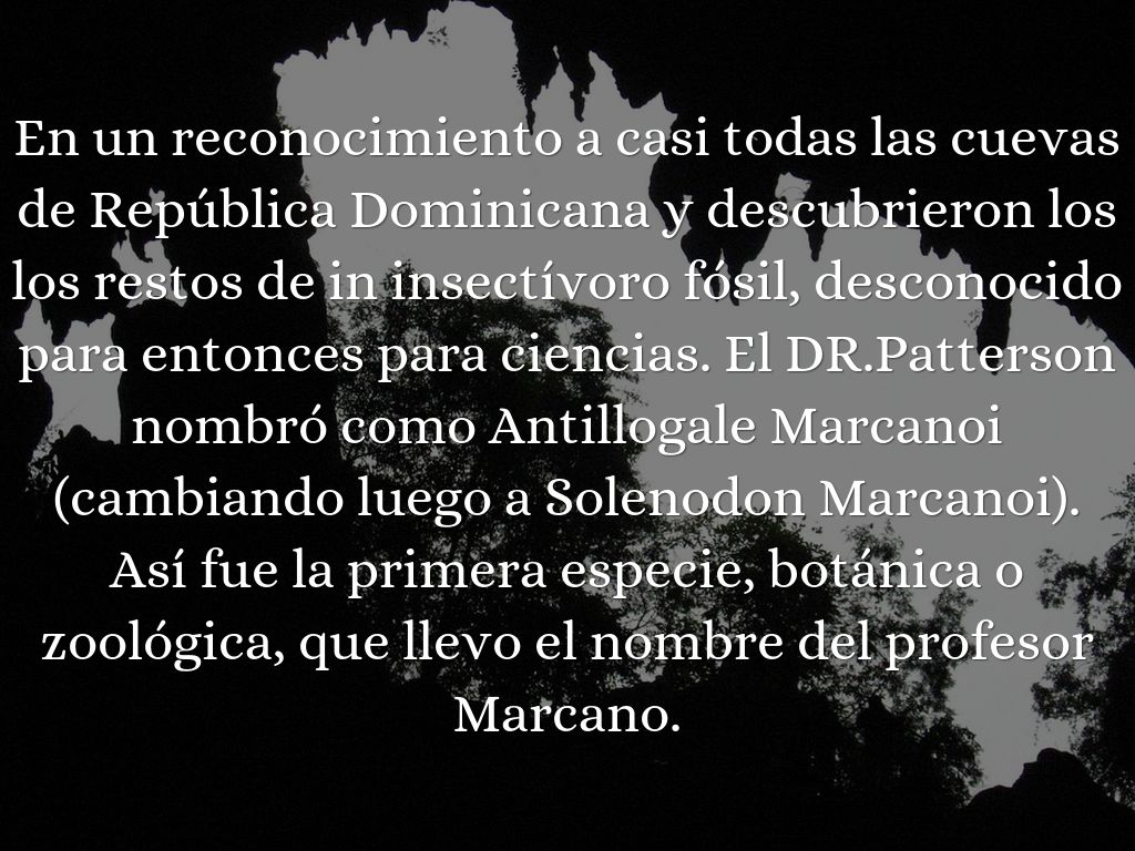 En un reconocimiento a casi todas las cuevas de República Dominicana y descubrieron los los restos de in insectívoro fósil, desconocido para entonces para ciencias. El DR.Patterson nombró como Antillogale Marcanoi (cambiando luego a Solenodon Marcanoi). Así fue la primera especie, botánica o zoológica, que llevo el nombre del profesor Marcano.