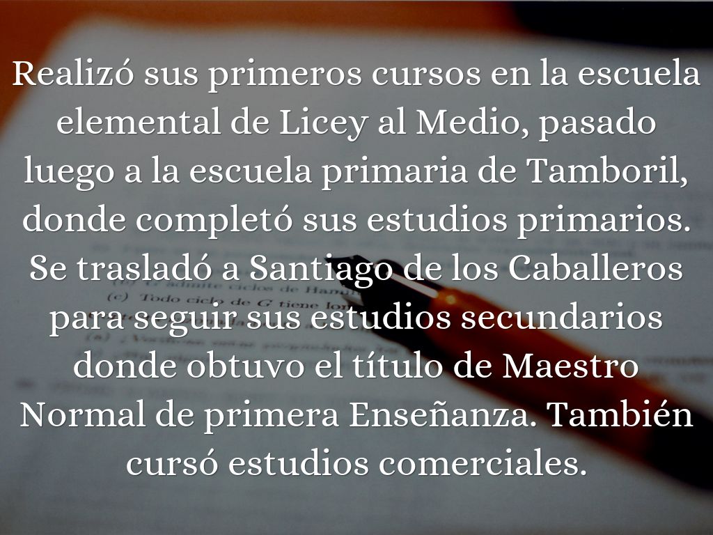 Realizó sus primeros cursos en la escuela elemental de Licey al Medio, pasado luego a la escuela primaria de Tamboril, donde completó sus estudios primarios. Se trasladó a Santiago de los Caballeros para seguir sus estudios secundarios donde obtuvo el título de Maestro Normal de primera Enseñanza. También cursó estudios comerciales.