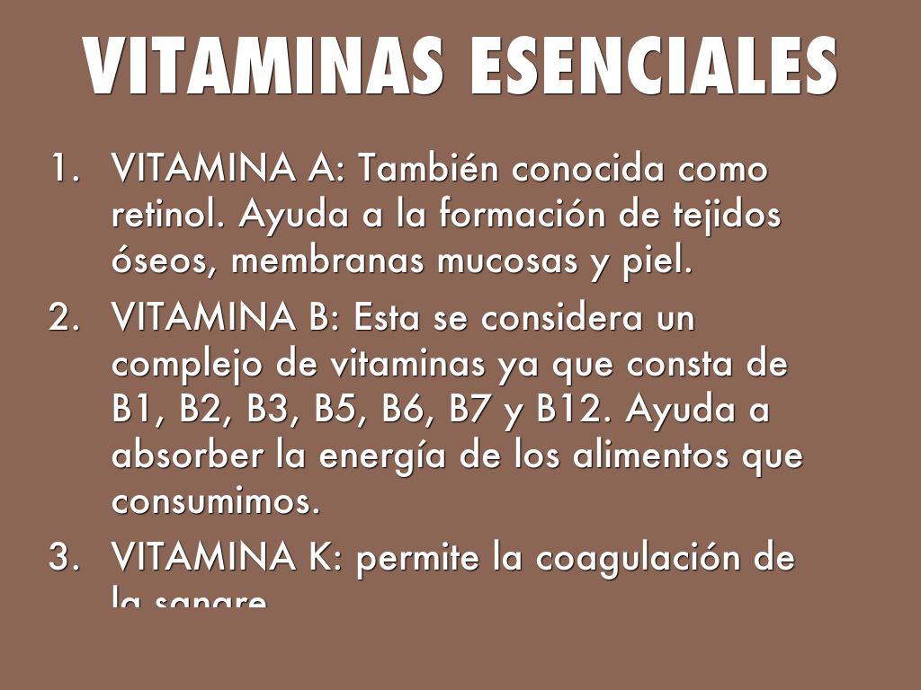 Son sustancias que el cuerpo necesita para poder crecer y desarrollarse de la manera correcta, en nuestro cuerpo hay 13 vitaminas esenciales: