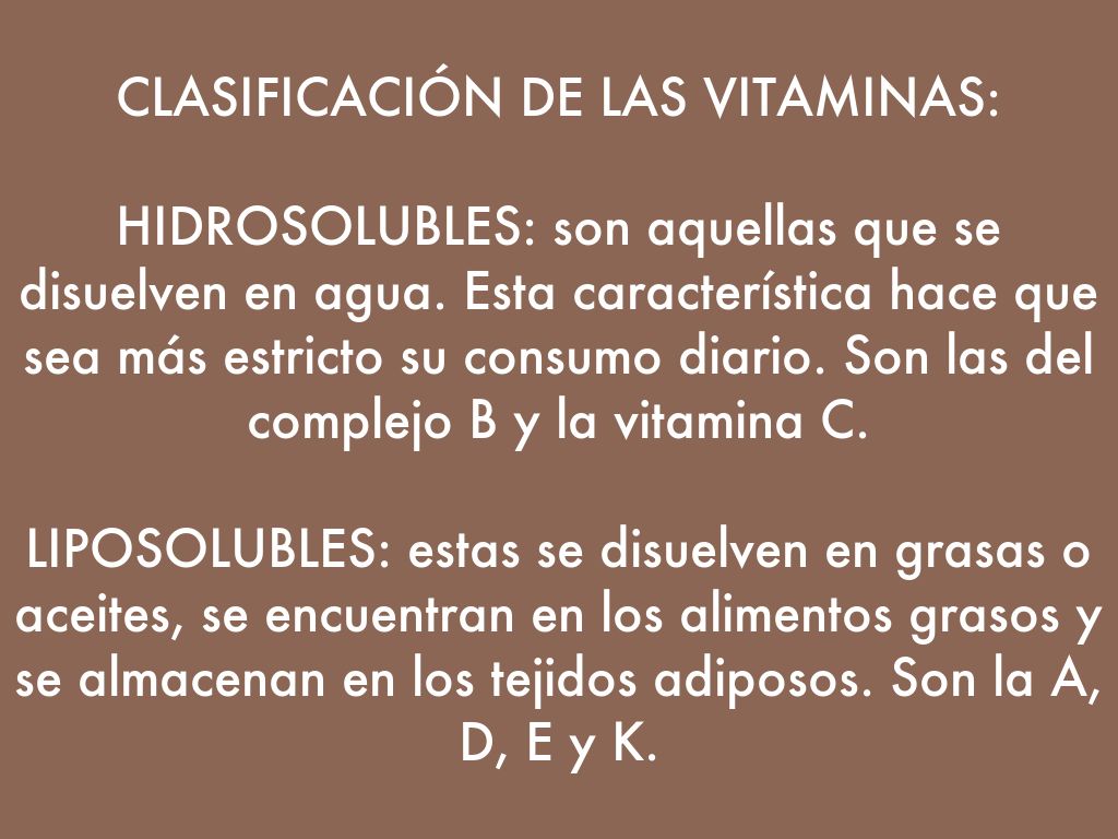 HIDROSOLUBLES: son aquellas que se disuelven en agua. Esta característica hace que sea más estricto su consumo diario. Son las del complejo B y la vitamina C.