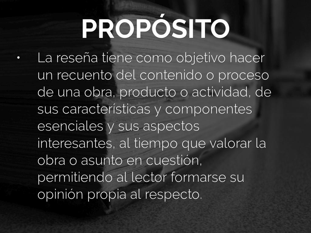 La reseña tiene como objetivo hacer un recuento del contenido o proceso de una obra, producto o actividad, de sus características y componentes esenciales y sus aspectos interesantes, al tiempo que valorar la obra o asunto en cuestión, permitiendo al lector formarse su opinión propia al respecto.