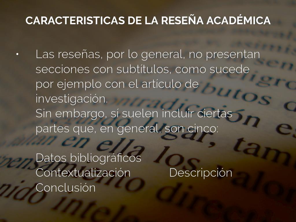 Las reseñas, por lo general, no presentan secciones con subtítulos, como sucede por ejemplo con el artículo de investigación.