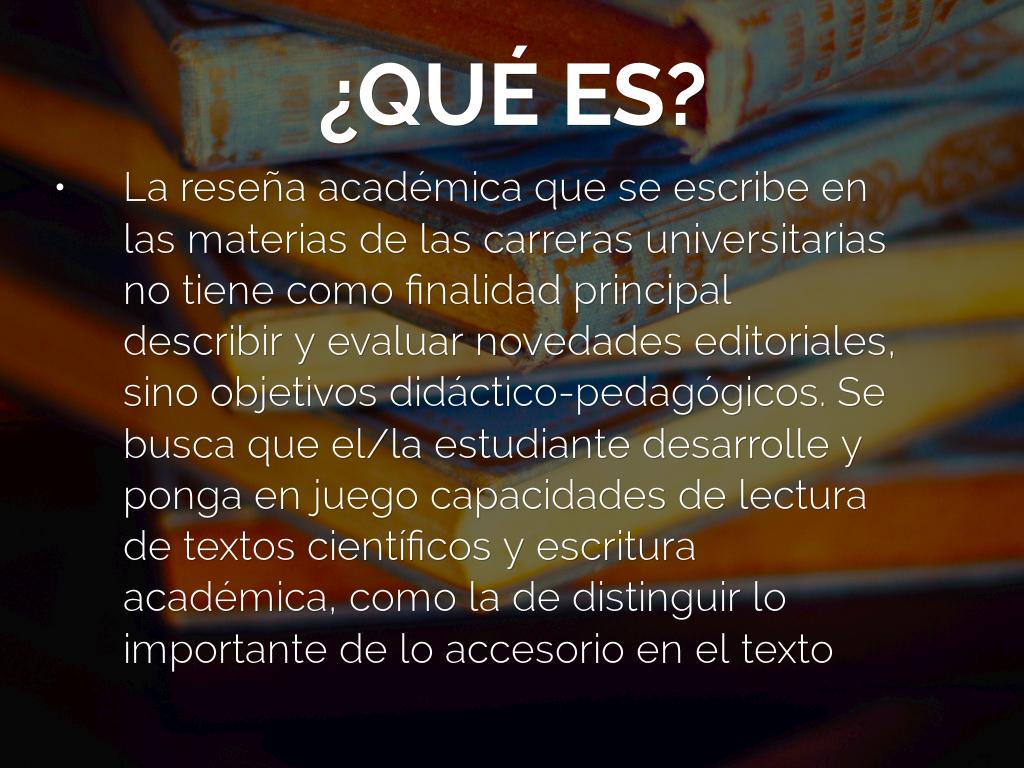 La reseña académica que se escribe en las materias de las carreras universitarias no tiene como finalidad principal describir y evaluar novedades editoriales, sino objetivos didáctico-pedagógicos. Se busca que el/la estudiante desarrolle y ponga en juego capacidades de lectura de textos científicos y escritura académica, como la de distinguir lo importante de lo accesorio en el texto reseñado y proponer una lectura crítica propia.