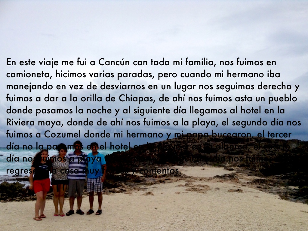 En este viaje me fui a Cancún con toda mi familia, nos fuimos en camioneta, hicimos varias paradas, pero cuando mi hermano iba manejando en vez de desviarnos en un lugar nos seguimos derecho y fuimos a dar a la orilla de Chiapas, de ahí nos fuimos asta un pueblo donde pasamos la noche y al siguiente día llegamos al hotel en la Riviera maya, donde de ahí nos fuimos a la playa, el segundo día nos fuimos a Cozumel donde mi hermano y mi papa bucearon, el tercer día no la pasamos en el hotel en la playa y en la alberca, el cuarto día nos fuimos a playa de Carmen y al siguiente día nos fuimos de regreso a la casa muy felices y contentos.