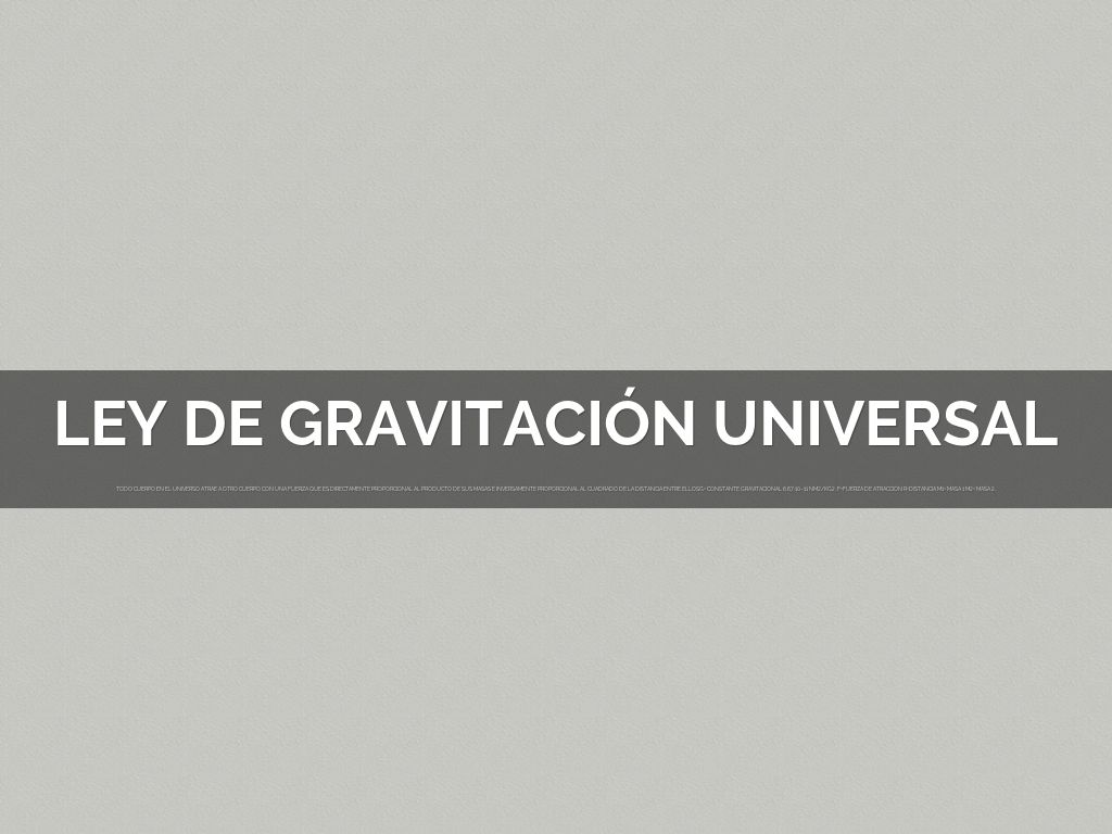TODO CUERPO EN EL UNIVERSO ATRAE A OTRO CUERPO CON UNA FUERZA QUE ES DIRECTAMENTE PROPORCIONAL AL PRODUCTO DE SUS MASAS E INVERSAMENTE PROPORCIONAL AL CUADRADO DE LA DISTANCIA ENTRE ELLOSG= CONSTANTE GRAVITACIONAL 6.67·10–11 NM2/KG2. F=FUERZA DE ATRACCIÓN R=DISTANCIA M1= MASA 1 M2= MASA 2.