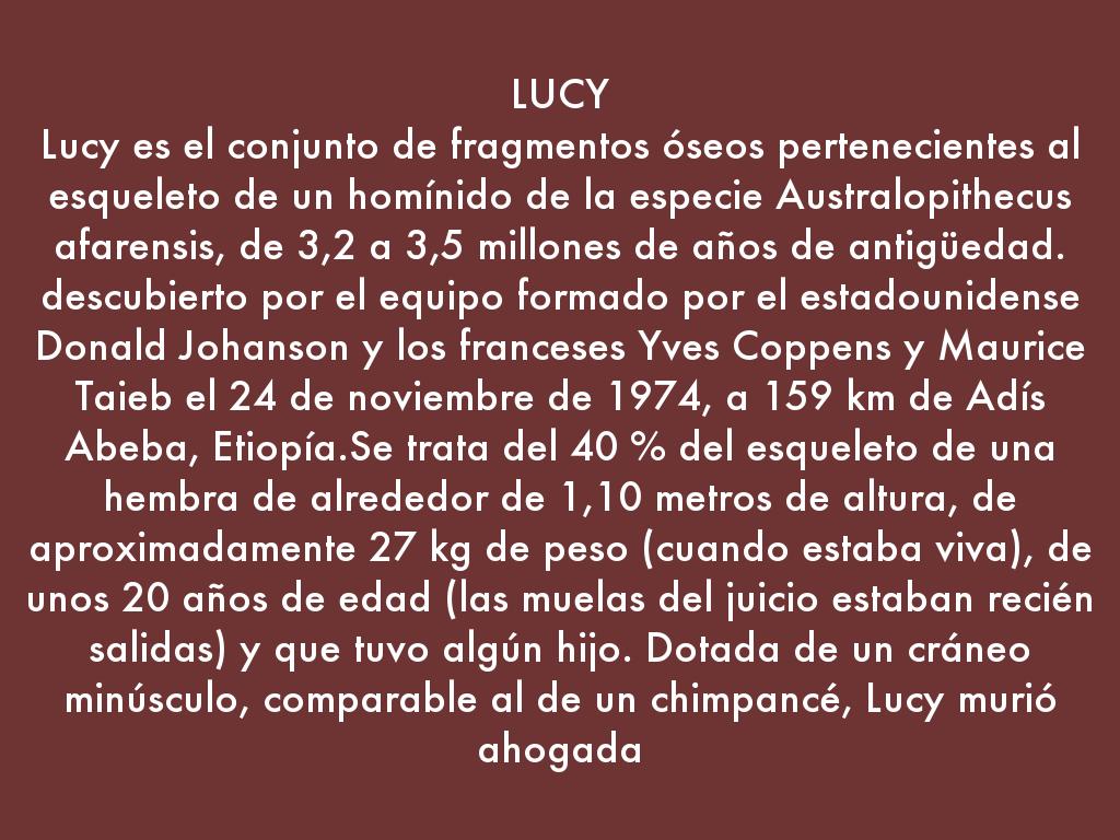Lucy es el conjunto de fragmentos óseos pertenecientes al esqueleto de un homínido de la especie Australopithecus afarensis, de 3,2 a 3,5 millones de años de antigüedad.