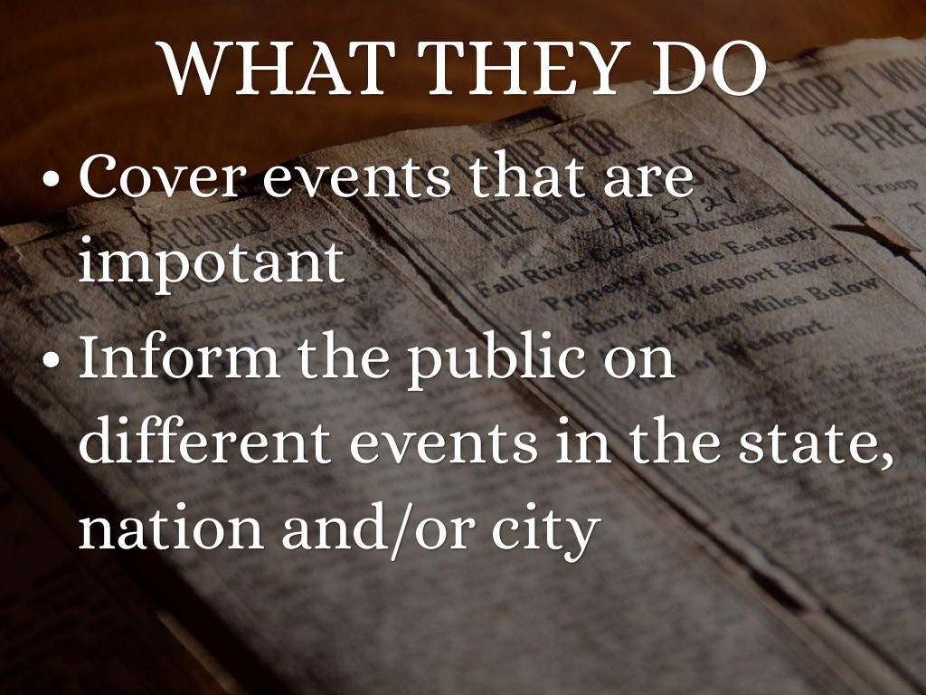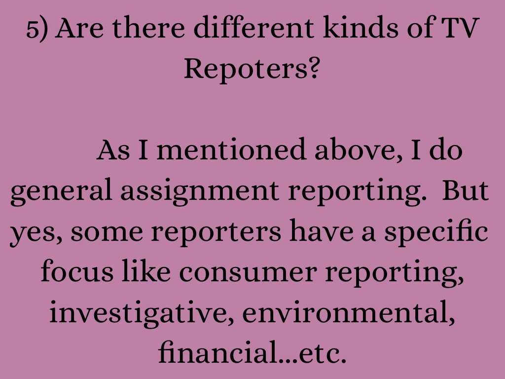 As I mentioned above, I do general assignment reporting. But yes, some reporters have a specific focus like consumer reporting, investigative, environmental, financial...etc.