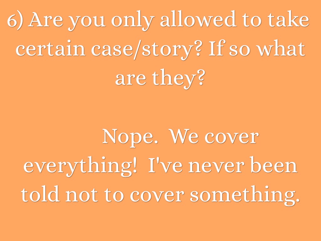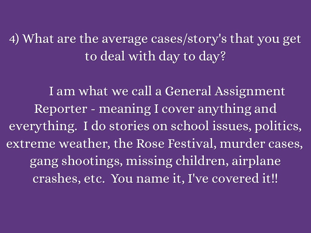 I am what we call a General Assignment Reporter - meaning I cover anything and everything. I do stories on school issues, politics, extreme weather, the Rose Festival, murder cases, gang shootings, missing children, airplane crashes, etc. You name it, I've covered it!!