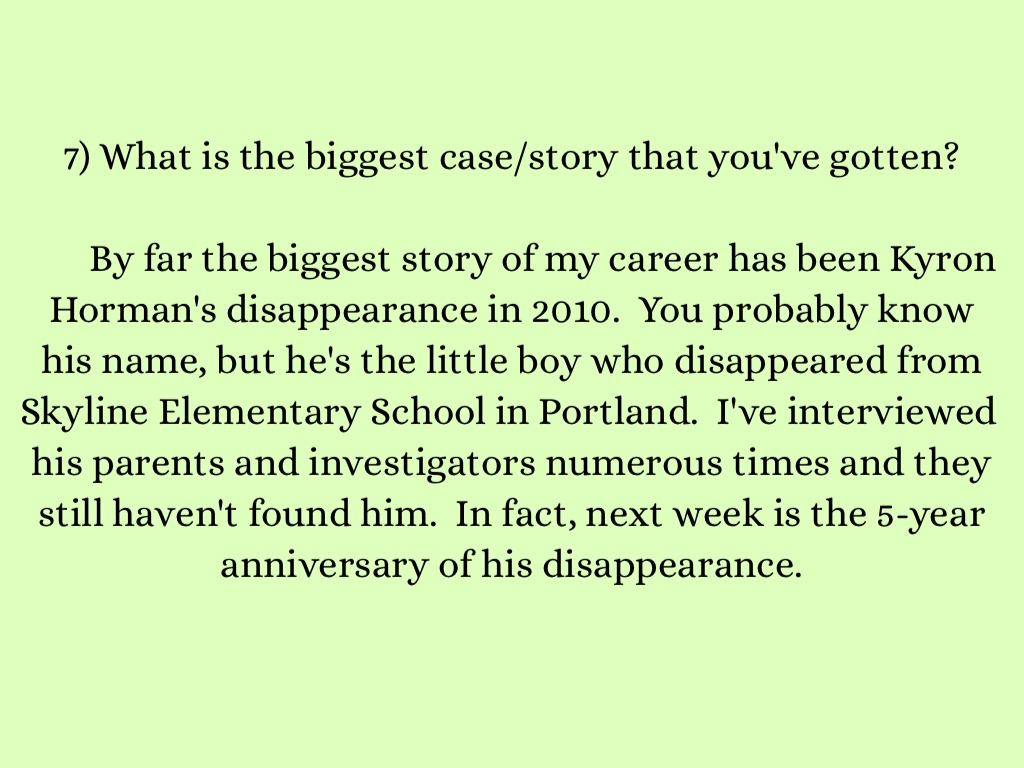 By far the biggest story of my career has been Kyron Horman's disappearance in 2010. You probably know his name, but he's the little boy who disappeared from Skyline Elementary School in Portland. I've interviewed his parents and investigators numerous times and they still haven't found him. In fact, next week is the 5-year anniversary of his disappearance.