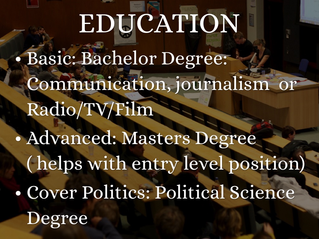 - Basic: Bachelor Degree: Communication, journalism or Radio/TV/Film