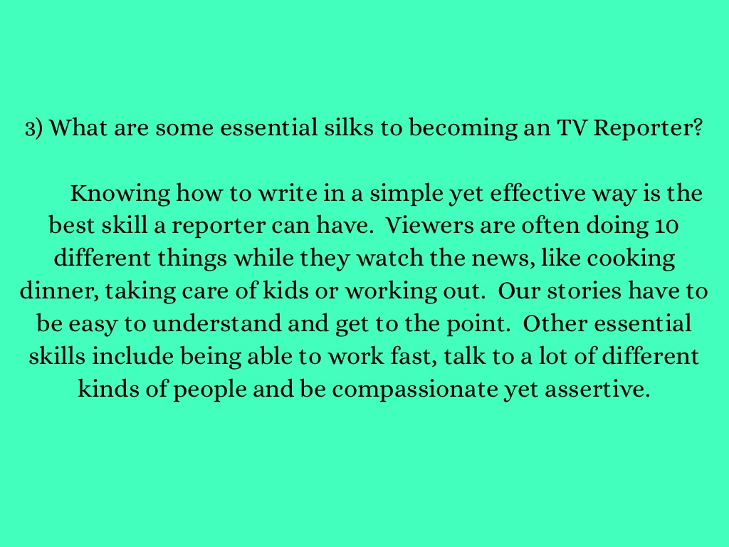 Knowing how to write in a simple yet effective way is the best skill a reporter can have. Viewers are often doing 10 different things while they watch the news, like cooking dinner, taking care of kids or working out. Our stories have to be easy to understand and get to the point. Other essential skills include being able to work fast, talk to a lot of different kinds of people and be compassionate yet assertive.