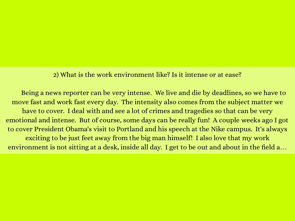 Being a news reporter can be very intense. We live and die by deadlines, so we have to move fast and work fast every day. The intensity also comes from the subject matter we have to cover. I deal with and see a lot of crimes and tragedies so that can be very emotional and intense. But of course, some days can be really fun! A couple weeks ago I got to cover President Obama's visit to Portland and his speech at the Nike campus. It's always exciting to be just feet away from the big man himself! I also love that my work environment is not sitting at a desk, inside all day. I get to be out and about in the field and working with really fun photographers. We try to make each other laugh all day!